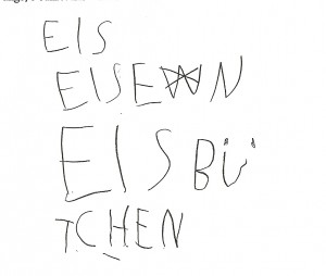 Die Kinder malten Ovale an die Tafel und alle anderen geometrischen Formen, die ihnen einfielen. Sie überlegten, in welchen Wörtern „ei“ vorkommt und schrieben sie (mit mehr oder weniger Anleitung) an die Tafel, zum Teil auch auf Papier.