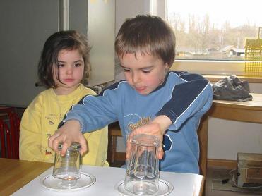 Bei ihren Ansätzen, eine Deutung zu finden, kann es sein, dass der Weg in eine andere Richtung geht, die eher als „falsch“ zu bezeichnen wäre. Dann wiederhole ich die Aussage des Kindes als Frage: „Ja? Ist die Luft verschwunden?“ – oder ich frage zum Beispiel: „Was glaubst du, wo die Luft aus dem Glas geblieben ist?“
