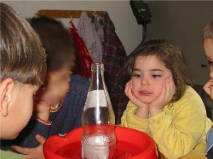 Bei diesem Experiment geht es um die Ausdehnung von Luft durch Erwärmen. Ich fordere die Kinder auf, sehr leise zu sein, da es bei diesem Versuch besonders auf die akustische Wahrnehmung ankommt. Es ist sehr kalte Luft in der Flasche, die habe ich zuvor mit den Kindern aus der Kühltruhe geholt. Dann wird die Flasche in warmes Wasser gestellt, eine Münze auf den Flaschenhals gelegt und gewartet, bis sich die Luft in der Flasche erwärmt, dadurch ausdehnt und so zu einem kurzen Klappern der Münze führt.